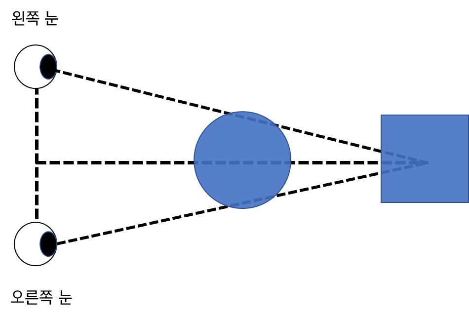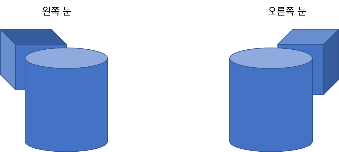 우선 왼쪽 눈, 오른쪽 눈으로 사각기둥 앞에 놓인 원기둥을 본다고 가정해 봅시다.